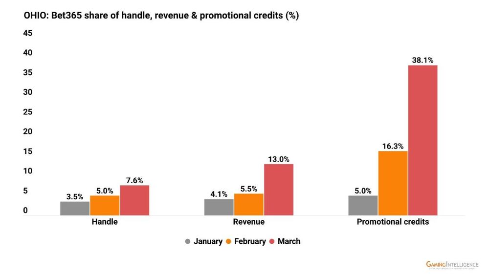 bet365 has adopted a different strategy in its use of promotional bets compared with its rivals in Ohio. Most brands had their highest promotional spending in the opening month of January before reducing it in February and March.