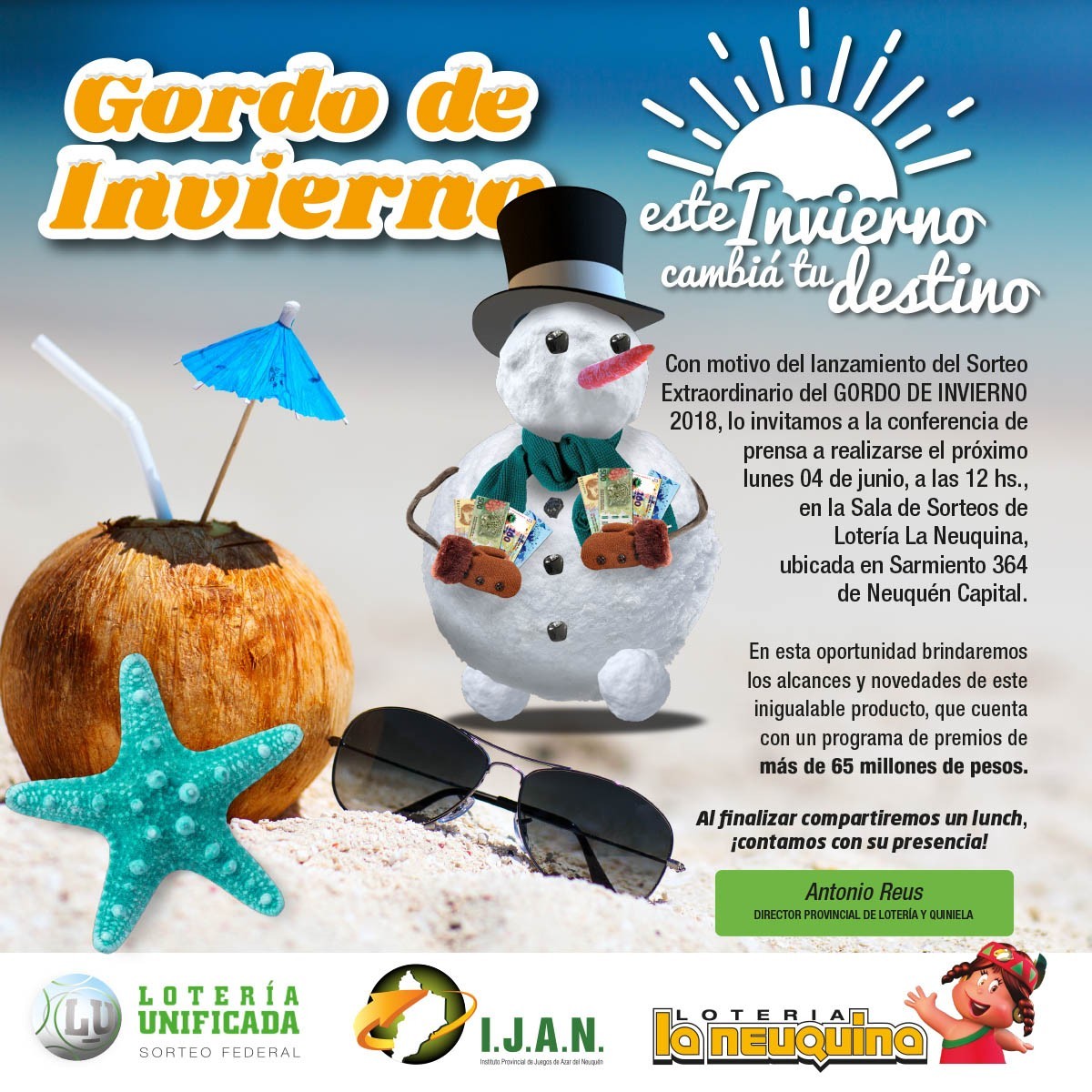 Argentina Neuquén.- 31 de Mayo de 2018 www.zonadeazar.com Gordo de Invierno Sorteo Extraordinario, Presentación, Lunes 4 de Junio en Lotería La Neuquina.