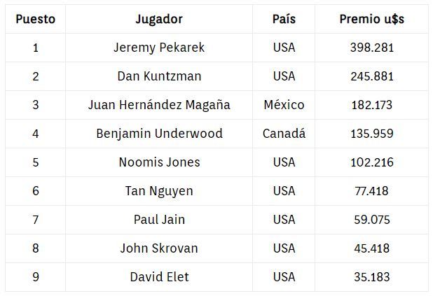 A la mesa final llegó el mexicano Juan Hernández Magaña, quien comenzó con el quinto mejor stack y llegó a ser el chip-leader cuando quedaban 3 jugadores. Pero luego de perder algunas manos pasó a ser el más corto y terminó eliminado con un bad beat. En un duelo pre-flop Juan se enfrentó con A-10 al 10-6 de Jeremy Pekarek, quien conectó un 6 en el flop y ganó la mano. El mexicano quedó tercero y obtuvo un premio de u$s 182.173 en su primera caja en la WSOP.
