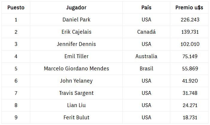 El brasileño Marcelo Giordano Mendes fue uno de los finalistas y quedó eliminado en la quinta ubicación, cobrando el mayor premio de su carrera: u$s 55.869. Es su primera mesa final en la WSOP, donde posee 5 cajas. Con este resultado llegó a u$s 201.015 en ganancias por torneos en vivo.